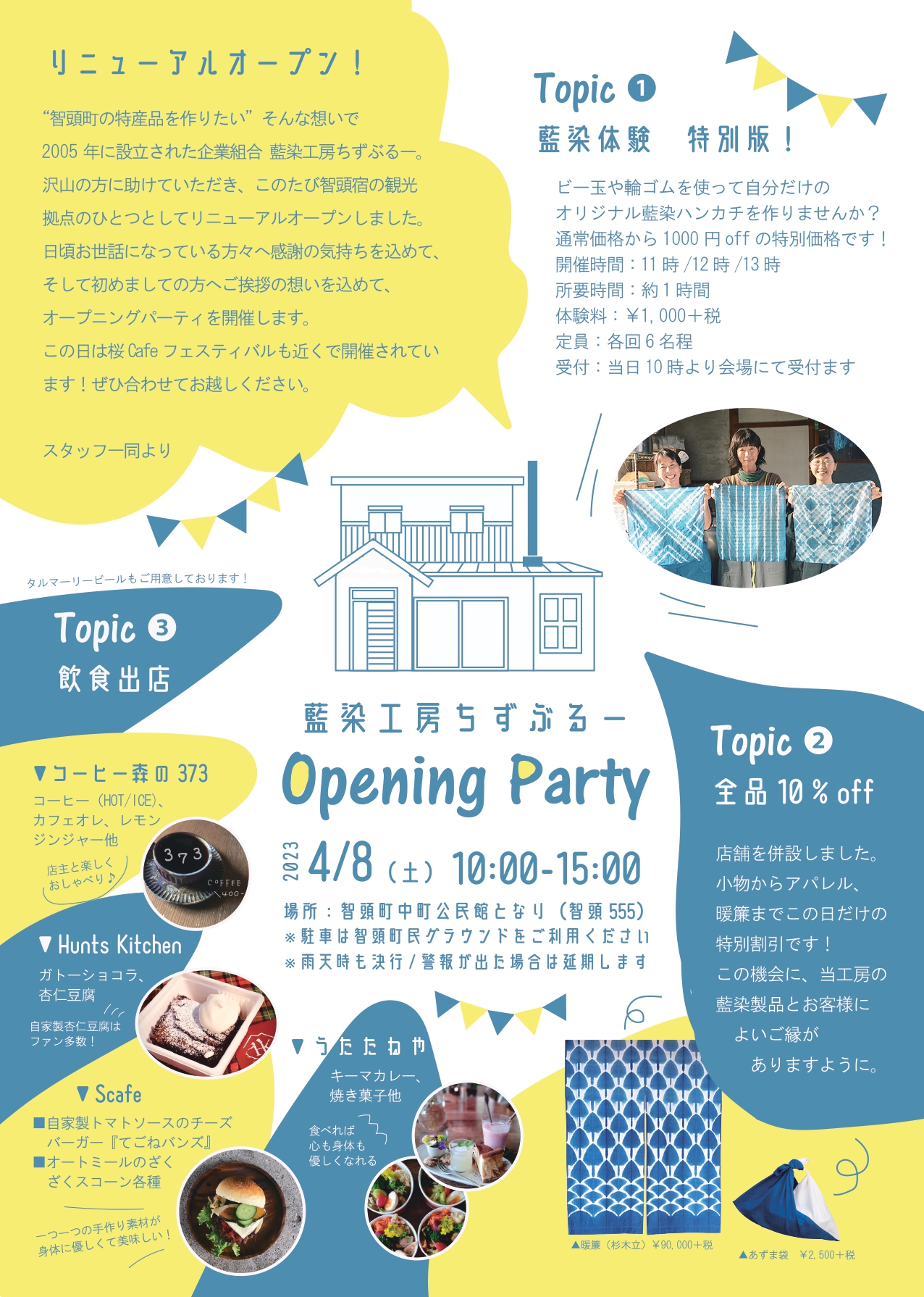 特別価格での藍染体験や製品の販売、そして飲食の出店もありますので、